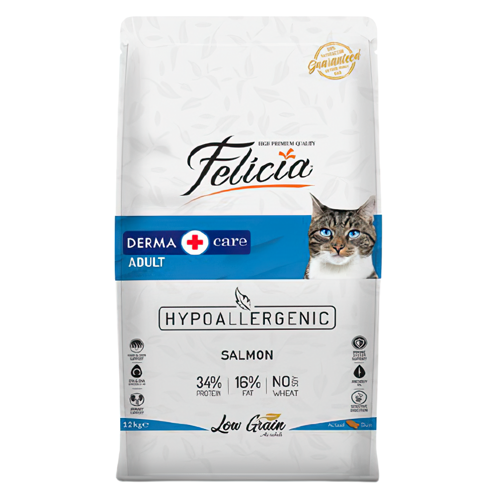Felicia Derma Care, tamamen tahıl içermeyen bir formülle üretilmiştir. Bu sayede, tahıl alerjisi olan kediler için ideal bir seçenektir ve sindirim sorunlarını önler. Ayrıca içerisinde bulunan somon yağı, kedilerinizin cilt sağlığını destekler ve sağlıklı bir tüy yapısına sahip olmalarını sağlar.