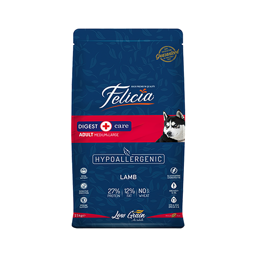 Felicia Digest Care Hipoalerjenik Az Tahıllı ve Kuzu Etli Yetişkin Köpek Maması, köpeğinizin sağlıklı ve güçlü bir bağışıklık sistemi için gerekli olan tüm vitamin ve mineralleri içerir. Ayrıca, omega 3 ve 6 yağ asitleri sayesinde sağlıklı bir cilt ve parlak tüyler sağlar. Köpeğinizin enerji ihtiyacını karşılamak için de yeterli miktarda kalori içerir.