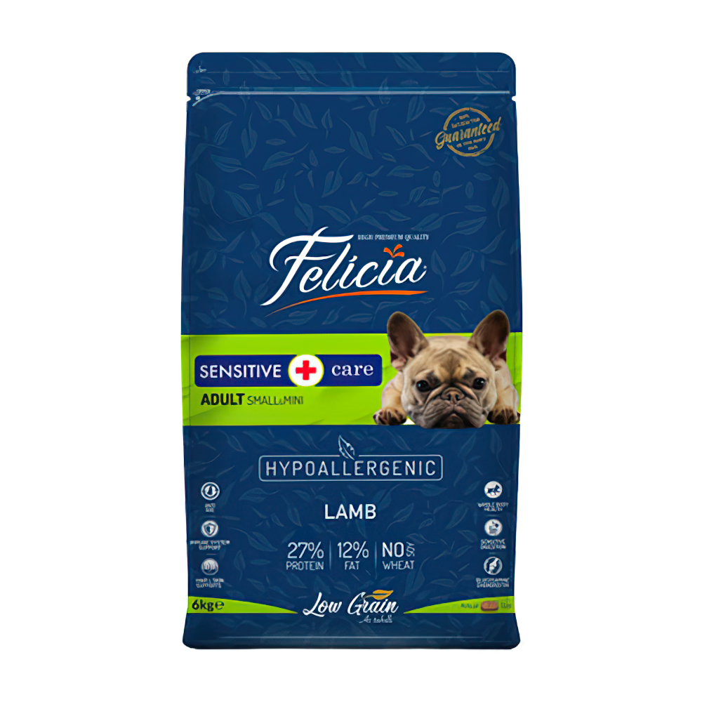 Felicia Sensitive Care Hipoalerjenik Düşük Tahıllı, Kuzu Etli & Pirinçli Küçük Irk Yetişkin Köpek Maması, küçük ırk yetişkin köpeklerin beslenme ihtiyaçlarını karşılamak için özel olarak formüle edilmiştir. Ürün, önemli bir protein kaynağı olan kuzu eti ile zenginleştirilmiştir ve pirinç gibi düşük tahıllı içeriklere sahiptir. Bu sayede, hassas sindirim sistemine sahip köpeklerin beslenme ihtiyaçlarını karşılamaya yardımcı olur.