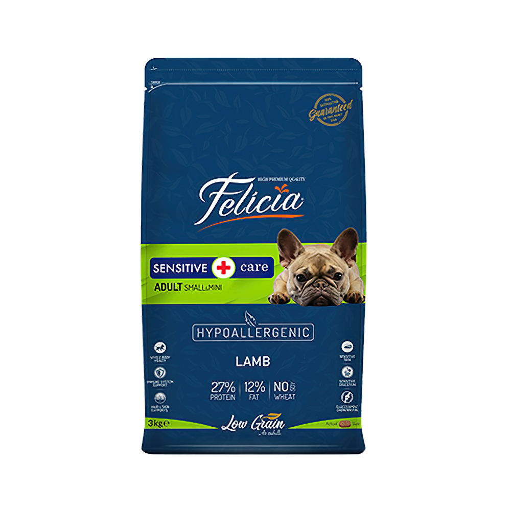 Felicia Sensitive Care Hipoalerjenik Kuzu Etli Küçük ve Orta Irk Yetişkin Köpek Maması, sağlıklı beslenme ve hassas sindirim sağlamak amacıyla özel olarak formüle edilmiş bir köpek mamasıdır. Bu mama, özellikle küçük ve orta ırk köpekler için tasarlanmış olup, 3 kg'lık bir ambalajda sunulmaktadır.