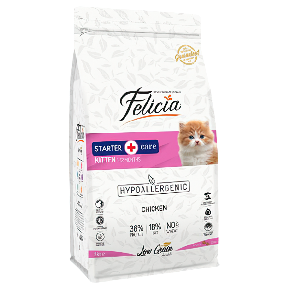 Felicia Starter Care Hipoalerjenik Az Tahıllı ve Tavuk Etli Yavru Kedi Maması, yavrular için özel olarak tasarlanmış bir kedimama markasıdır. Özellikle tahıl ve tavuk etine alerjisi olan kediler için ideal bir seçimdir. 2 kg'luk ambalajıyla, uzun bir süre kullanım imkanı sunar.