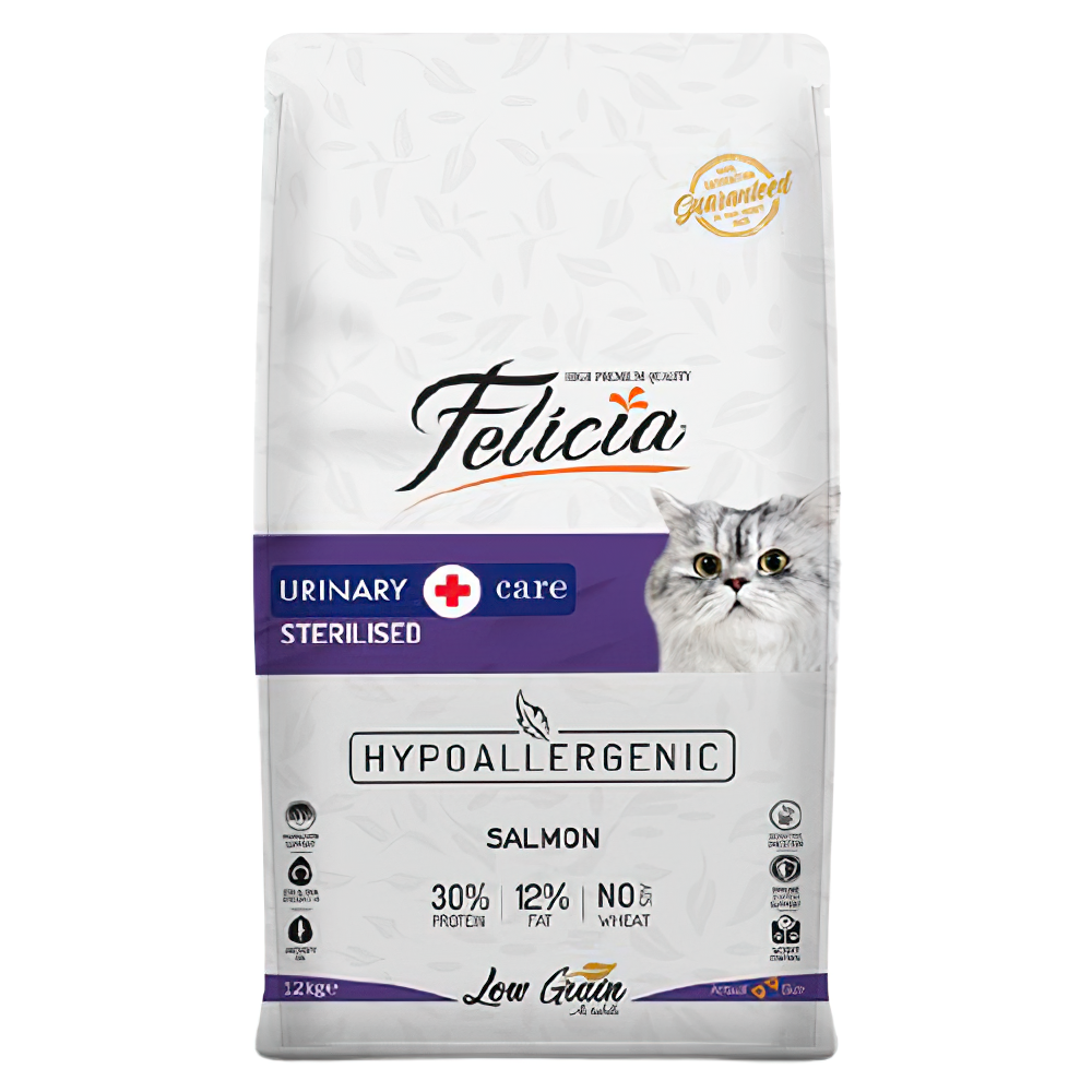 Felicia Urinary & Care Hipoalerjenik Az Tahıllı Somonlu Kısırlaştırılmış Yetişkin Kedi Maması (12 kg), kedilerinizin sağlıklı bir yaşam sürdürmesine yardımcı olmak için özel olarak formüle edilmiş bir kedi mamasıdır. Bu ürün, alerjisi olan kediler için özel olarak hazırlanmış ve mide-dostu bir formüle sahiptir.