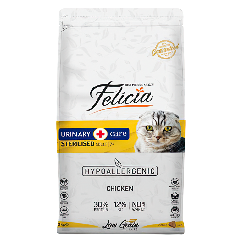 Felicia Urinary & Care Hipoalerjenik Az Tahıllı Tavuk Etli Kısırlaştırılmış Yetişkin Kedi Maması, Türkiye'de öncü bir marka olan Felicia tarafından özel olarak formüle edilmiş bir kedi mamasıdır. Bu özel kedi maması, özellikle idrar yolu problemleri olan kısırlaştırılmış yetişkin kedilere yönelik olarak tasarlanmıştır.