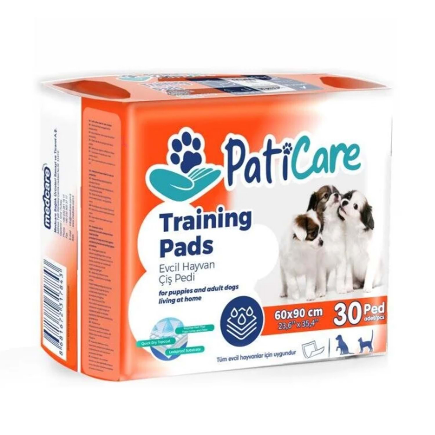 Paticare kedi ve köpek çiş pedi; Kedi ve köpeklerin tuvalet ihtiyaçları göz önünde bulundurularak üretilmiştir. Boyutu 60x90cm'dir. Çiş pedi, paket içinde 30 adet bulunmaktadır.