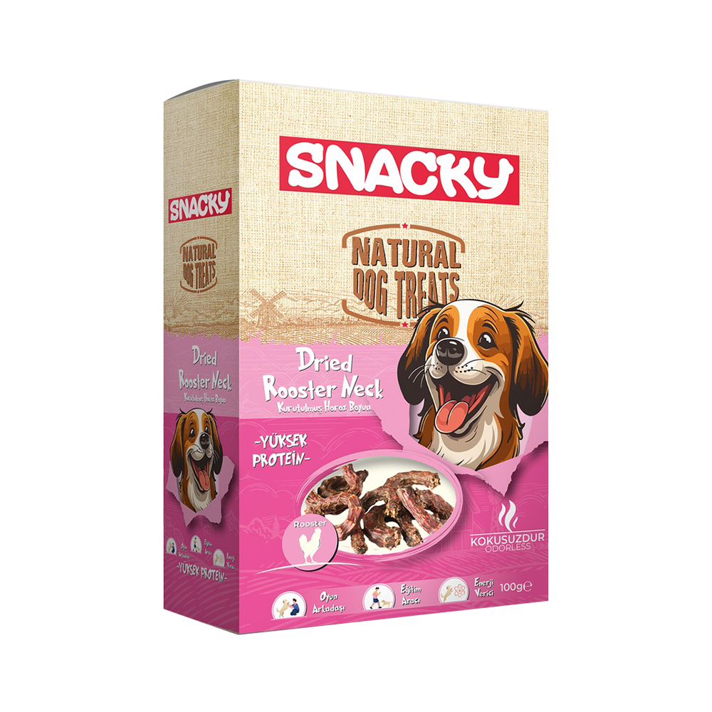 Snacky Kurutulmuş Horoz Boyun, taze horoz etinin özenle seçilip, uzun bir süre bekletilip ardından doğal yollarla kurutulmasıyla üretilir. Bu ürün, doğal ve sağlıklı bir işlemle üretildiği için koruyucu ve katkı maddesi içermez. Ayrıca işlenme aşamasında sağlık ve hijyen koşullarına son derece dikkat edilir.