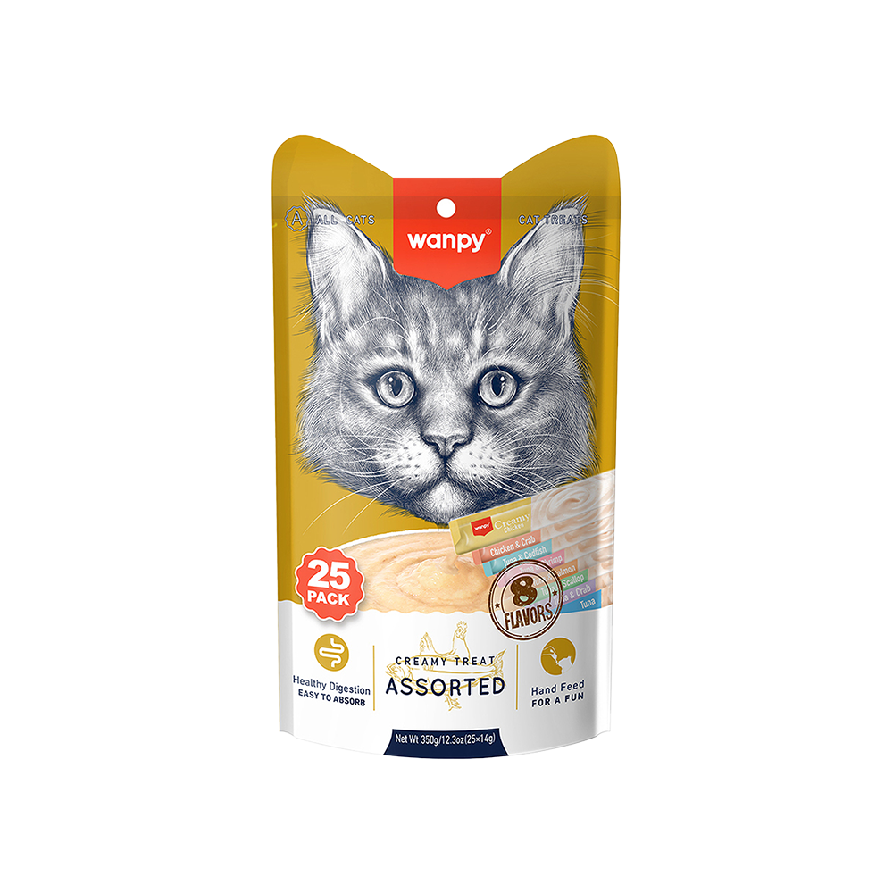 Wanpy Bağışıklığı Güçlendirici Sıvı Kedi Ödülü, her kedinin severek tüketeceği lezzetli aromalarla geliştirilmiştir. 25 adet 14 gramlık paketlerde sunulan bu ödüller, tazeliklerini korumak için tek kullanımlık olarak tasarlanmıştır. Böylece, kedinize günlük olarak taze bir besin sunma imkanı sağlar.